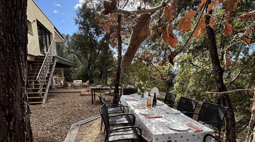 Temidden van een bosrijk gebied, waar de zon volop toegang heeft, ligt deze moderne villa die meteen in het oog springt door haar originele architectuur. Strak en eigentijds, maar toch volledig in harmonie met de omliggende natuur van het rustige, royale privéterrein, zonder omheining. Er staan op gepaste afstand nog enkele andere vrijstaande huizen, waardoor de ligging sereen, maar niet geïsoleerd voelt. De villa bevindt zich op een ideale locatie: enerzijds niet ver van het charmante dorp Lorgues, anderzijds op steenworp afstand van het prestigieuze wijndomein Château de Berne --een paradijs voor wijnliefhebbers, wandelaars en fijnproevers-- met restaurant en wellnessfaciliteiten. Een deel van het huis is op palen gebouwd, dat verklaart ook het verschil in hoogte. De entree is aan de zijkant van de villa op het iets hoger gelegen woonniveau. Het zwembad van 11 x 4 m (diepte 1.20-1.50 m) ligt aan de zuidkant van het huis. Daar in de buurt kun je in de schaduw van enkele bomen aanschuiven voor een heerlijke lunch. Er is tevens een plancha-grill (gas). Het zwembad is beveiligd met een elektrisch rolluik. Op aanvraag kan het worden verwarmd. Ligbedden staan uitnodigend klaar bij het terras rond het zwembad. Er is parkeergelegenheid voor zeker 4 auto’s.